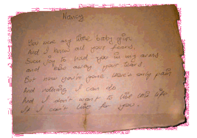 | Nancy You were my little baby girl and I knew all your fears Such joy to hold you in my arms And kiss away your tears But now you're gone There's only pain And nothing I can do And I don't want to live this life If I can't live for you |
