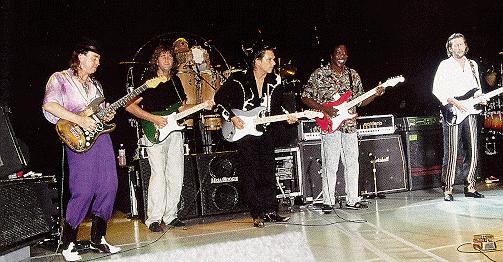 | From the left: Stevie ray, Phil Palmer, Jimmie Vaughan, Buddy Guy, and Eric Clapton..On stage at Alpine Valley August 26th, 1990 |