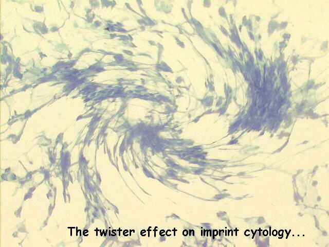 The enthusiastic surgery service resident got carried away doing the imprint cytology of a lymph node, and got what I call the "twister effect"...
