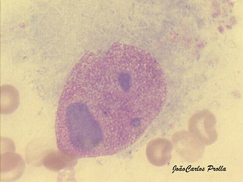 Isn't a spetacular case of antropomorphism? This curious cell was seen in a FNA specimen from a subcutaneous scalp nodule of a 45-year old male with adenocarcinoma of the lung.