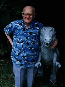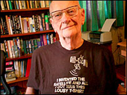 Sir Arthur sports an appropriate T-shirt in 2005. (From BBC site) Sir Arthur digs into some mango ice cream at the Galle Face Hotel, Oct. 2, 2002; courtesy of Wayne Houser) Sir Arthur with Hector Ekayanake (center) and Wayne Houser of Visalia, Calif., having lunch in ACC's garden, October 2002 Sir Arthur with Wayne Houser of Visalia, Calif., October 2002 Sir Arthur with Wayne Houser of Visalia, Calif., October 2002 Candid shot from Richard Murch's personal collection Clarke with buddy T. Rex Tyrone; Sir Arthur says he relies on his wheelchair now, but can lean on the table while playing table tennis, or on a friend -- as seen here. Sir Arthur with Buzz Aldrin in Colombo, March 2001 Sir Arthur with Buzz Aldrin in Colombo, March 2001 Image from 2001 "The City and the Stars" concert Courtesy of Wayne Houser At work |