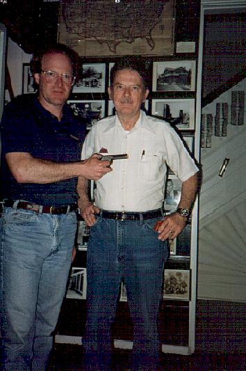 Sandy Jones and Joe Pinkston with the original wooden pistol (photo courtesy of Sandy Jones)
