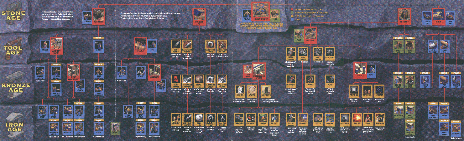 | You can find a listing of all the units and techs in Age of Empires listed in order by which age they are available in. It also shows which upgrades are needed in order to get other upgrades and what each upgrade does. It is currently hard to read, but you can still see the pictures. I am working on editing in order to be able to read it. It is the same as the foldout that comes with the Age of Empires game. | |||||||||||||||||||||||