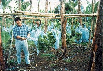 Anjing, Anjong, and Jojie formed a company and called it MAMA International Trading, after their and their youngest sisters middle initials. Using tissue culture from Davao, planting be-gan in early 1996 on their grand-fathers 11.66 hectare farm at the edge of the Del Monte plantation in the town of Libona. They started har-vesting in February this year at 300 kg per week; this has since increased to 3,500 kg per week by September. All the techniques have been adapted from Anjongs experiences on large plantations, and this meant a great change from the traditional way of doing things in Bukidnon. It starts already by wrapping the banana bunches with chemically impregnated plastic bags and using coded colored tags to ensure that the bananas are harvested at the right time. Then there are new carrying trays to bring them from the cutting area to the washing area. "We cover our bananas with special blue plastic to create a mini-climate and prevent insect damage. The trays are uncomfortable to use but its the only way to maintain excellent quality without any bruise to the fruit. After washing and drying, the packing is just as important because the plastic crates are expensive but really effective. Our bananas command a good price and our customers really appreciate the quality we give them," says Anjong.