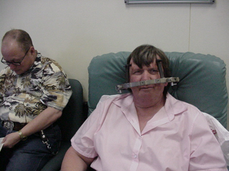 With ring on my head I had a CT scan enabling the doctors to determine the exact co-ordinates as the Treatment relies upon developing co-ordinates, to show exactly where my lesion is and important brain structures are the metal ring is a reference plane. The frame can be seen on the imaging equipment and provided Radiosurgery staff with an exact set of coordinates so that the lesion or tumour is targeted precisely.