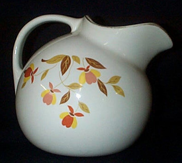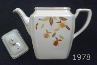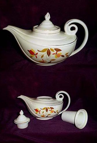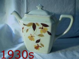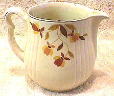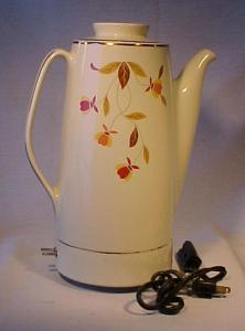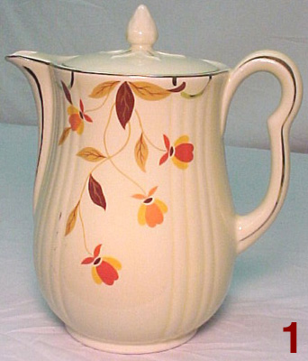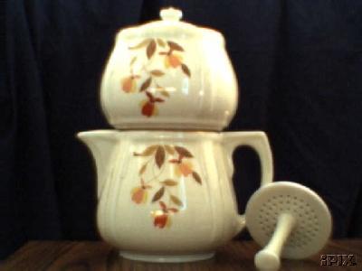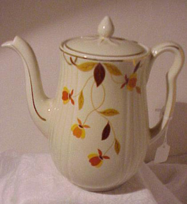 Tall Coffee/Tea PitcherThere are two sizes of this coffee pot, the 8-cup and the 9-cup9-cup coffee pot 9 1/2" tall Approximate Value: $50.00 - $70.00 8-cup coffee pot 8 1/2" tall x 7 3/4" wide Approximate Value: $40.00 - $60.00 On the bottom of the pot it says (in gold) "For Piping Hot Coffee Preheat with Hot Water - Do Not Place Over Open Flame". (as seen in image 4) Two different coffee makers were also offered with this coffee pot. In 1936, the open drip coffee maker was offered, this is shown in image 3. This piece was only made for a short period because the lid to the coffee pot couldn't fit on the open drip, this meant keeping track of more pieces. In late 1937, the metal dripper was offered, this is shown in image 2. The lid to the coffee pot will fit on the dripolator. This piece also has an autumn leaf imprint in the metal.