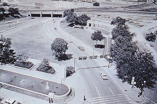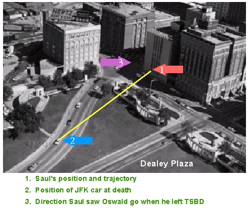 Here is a view from atop the County Records Building. "Saul" was on the second story, having a lower view than this. The darker gray car is in the approximate place where JFK's Presidential limousine was located when he took the killing shot. Notice that the Grassy Knoll is directly behind that. Only this angle of fire affords the opportunity to hit Governor Connelly also. Whoever published this photo titled it, "The Shooter's Location". It is curious that they came so close. "Saul" said he sat in Dealey Plaza, studying his options, the day prior to the assassination.