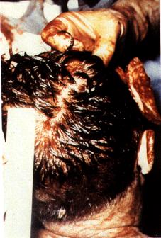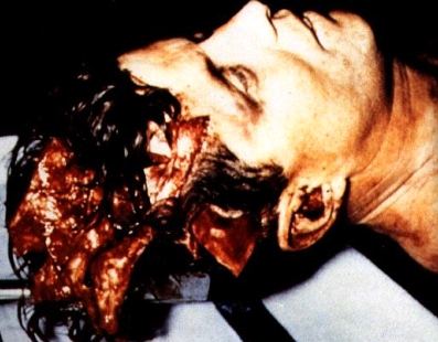 The red spot next to the white ruler in the upper leftmost photo is the small entry wound; there are no marks on JFK's left side; there was a large 5 cm. exit defect on JFK's right side. Large flaps of skull bone can be seen, covered with hair, blood, and brain matter. This killing wound came from JFK's left rear (from the COUNTY RECORDS BUILDING, not the Texas School Book Depository Building, the Stemmons Parkway Bridge in front of the car, or the Grassy Knoll to the right of the car) and the fragments exited toward the Grassy Knoll to the President's right and front. The head jerked backward due to the bullet's explosive exit toward the front. "Saul" said such a bullet would have built up tremendous pressure as it traveled through the brain cavity. Upon exit, an explosion of tissue, blood, and bone fragments occurred, jerking the head backward. Head shots quite often cause massive jerking of the body, anyway.
