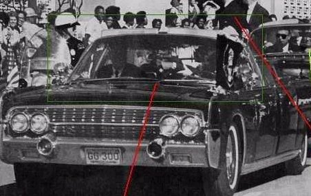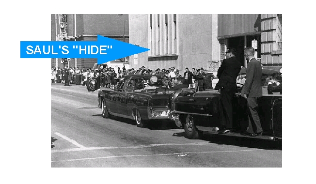 In the left photo, JFK is leaning to his left and his head is turned to his left, also. This is just immediately before the shot that killed him was fired. At this point, the exact location of the true entry wound is pointing directly at "Saul" in the County Records Building to the car's left rear. The faint line shows that angle of trajectory, exactly matching JFK's death wounds.