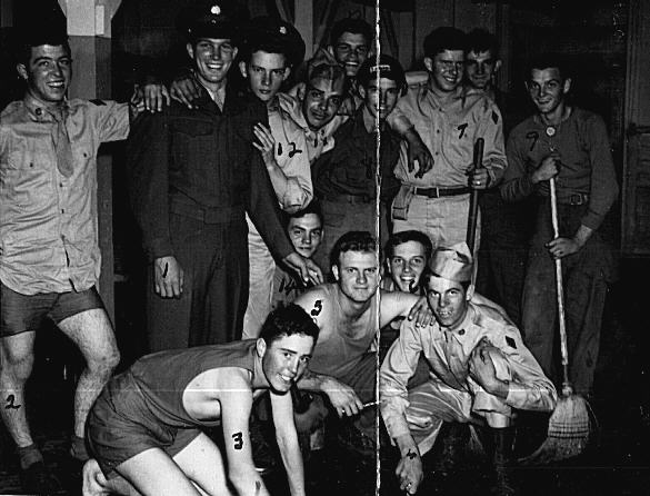 | GI Party, 3rd Platoon, Co F., 11th Regt., 5th Inf Div Ft Jackson, SC Sept 1947. All previous week, Platoon Sgt Marwede promised a GI party come Wednesday evening. Man! I think I'm gonna like this mans Army, after only one week we get a party!! Bet there will be girls from Columbia, music, chow and drinks. Surprise!! Old ex Navy swabbie who had enlisted in the US Army as a private said, "this looks just like clean sweep down fore and aft" !! He sure knew what he was talking about, as the good ex "Kraut" Platoon Sgt grabbed a couple recruits to haul in soap, mops, buckets, brushes etc. Back l/r: Cleo Robertson, Altus, OK. (Direct to Korea from Basic, died on sentry duty one week after arrival: Matthews, Ark: Mulkey, from ??: Poore, NYC: Morgan, NE USA: Landry, LA: Rader, Wash DC??: Miller, ??: Needham, ??: Front l/r: Jim Lynn, Wayne, OK: Kelloway, ??: Watts, ??: Keese, ??: Keith, ??: |