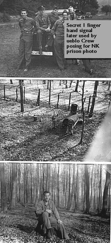 | Sam and Bill displaying secret one finger hand signal later used by crew of USS Pueblo, posing for photo in North Korean Prison |