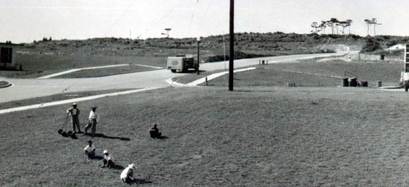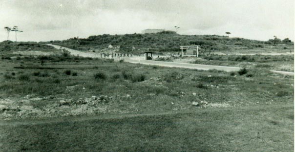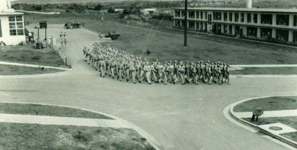| View (below) of Sobe Sta Man Gate from Bks three, troops on forced march, playing Army for Maj Treffery, making blisters - bummer!!!! This view across vacant area where club/pool etc were later constructed - must have been nice!! |