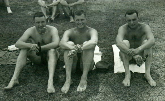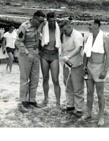| Not all hacking dits and/or rolling tape - Trick Trhee beer bust at Ishikawa Beach, 1954. Above: Jim Lynn, Ch Trk 3, Chas "Tex"Richards, Comm Cen, (Late) MSgt Russ Sinclair, set up the first ASA presence on Taiwan - one of the finest to serve the US Army Security Agency, Bob Monk, TRRS, Mexico Cy, Teheran, (SgtMajRetd) Lynn, Richards and Monk, below, same BeerBust |