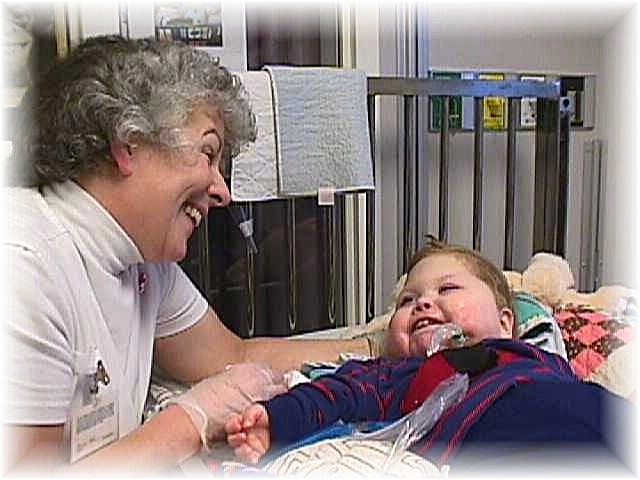 | "This is one of my nurses I smile at. I'm funny! Everyone loves me, I guess. All these tubes around me are sure fun to grab! I have to have them cause I have Spina Bifida. If you want to know more about that, my daddy says click on it. I have help breathing sometimes from a ventilator. I also eat thru a button in my tummy. It's boring. My friends here are, well, pretty much everyone I meet! I also have a piano my parents gave me. It tells me to play a song and I do! Mommy and daddy and sisters loved me being home, and so did I, but right now I have to be here for my school and therapy. Everyone helps me very much! I'll tell you their names later, daddy can't remember!" | |||||||||||||||||||||||||||||||||||||||