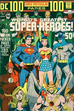 | to appreciate the past, and the 40s and 50s loomed large in my fathers and uncles conversations. These heroes became even more important to me, as they really stood for something, beyond fighting crime and such. They stood for what was right. There was a true camaraderie between these old timers, an easiness of friendship, and an accountability to each other you would not have found in Marvels "Avengers". And you still won't find, even in todays JLA, sadly. These days, comic book nostalgia is sold via trade paperbacks in book stores. In 1976, it was DC reprints in drug store spinner racks. Guess which one I'd pick? Maybe it was the Bicentennial had something to do with it, but mid-70s America was awash in nostalgia and her past. This was just as true with comics. Sure, there had been the legendary "80 Page Giants" of the 60s, but what was it, really, about the 70s that made publishers hit us kids with so many reprints? One main reason, one word: economics. The publishing industry was facing a paper shortage in the 70s, and it was up to those publishers to find a way to remain profitable, but cut corners without raising costs.And it was National Periodical Publications editor and publisher Carmine Infantino who came up with the idea that would influence comics to this day: 100 Page Super Spectaculars. |