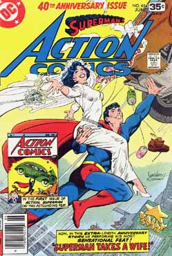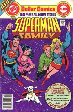 | with). It was a grand time... one might read the latest adventures of the Justice Society in the revamped "All-Star Comics", then read their WWII-era exploits in a digest! Then the rug was pulled out from under the oldies... Carmine Infantino 'retired' from DC, only to be replaced by a kids magazine publisher named Jeanette Kahn. She had ideas for DCs future, and most didn't include its past. Gone was the old DC logo, replaced by the "Star-Bullet" logo, still in use today....and I still don't like it. And new was the theme at DC. Kahn decreed all stories should be new in the monthly publications, as with rising prices, what kid wanted to buy old stuff? And if prices are going to go up, it was figured, lets give 'em the most bang for their buck. With 1977s "Superman Spectacular", a new format was introduced, the DC 'Dollar Comic'. No ads, 80 pages, all new, for only a dollar! This seemed too good to last, and it was. After a decent start, the books began featuring sub-par art with increasing frequency. Page numbers were cut, and cut again, ads were introduced...DC seemed so sure of the new format that several books, like "Worlds Finest", "Detective" and "Superman Family" were now published, monthly, as Dollar books. But what mother was going to give her kid a whole dollar for just one comic? |