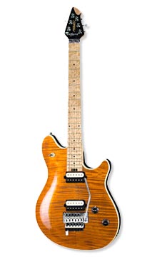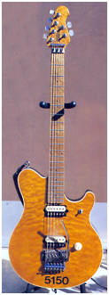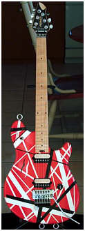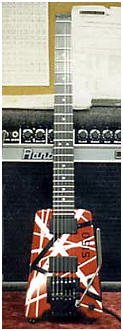 In 1991, Ed worked with Ernie Ball Guitars to design a model of his own, that would work as exactly what he wanted, but a guitar that could be sold to anyone who wanted one. After Ed cut off his association with Kramer ( he says he got tired of having to hop a boat to Taiwan to see the guitars being built for him), Sterling Ball pestered Ed until he decided to design a guitar for them. Working with James Brown (no, not the godfather of soul) on pickups, Ed finally got what he wanted. By the time of the "For Unlawful Carnal Knowledge" album, the EVH Music Man was ready to go. For the first time, Eddie was happy with a neck and bridge pickup combination. At this point, Eddie was also working with Peavey on his series of 5150 amps. When it eventually became apparent Music Man could not produce instruments to satsisfy demand (many times you were faced with a wait of over a year for one!) he left his body design, pickups and all and went over to Peavey full tilt. The third guitar you see is a custom made Peavey Wolfgang guitar, with an assembly line model seen beside it. There is a slight body difference, and the pickups designed by Ed and Steve Blutcher, are a tad hotter but sweeter, and the selector switch has been moved to the upper horn, since Eddie had a tendency of hitting the switch on the MM accidentally. Eddie had said he was very happy with his set-up in the late 90's, but by 2004, things had changed. Eddie dropped his contract with Peavey, and has been producing a limited line of custom guitars for Charvel/Fender. He'd been seen using both these new Charvels as well as the Wolfgangs live on the tour to prmote Van Halens CD "Best of Both Worlds", which reunited the Hagar-era band. These continued to be used during the 'Van Halen mk. 3' tour.There is even an exact duplicate of Frankenstien being sold, but if you want an axe even Ed says he can't tell aprt from the original...be prepared to shell out around $25,000! |