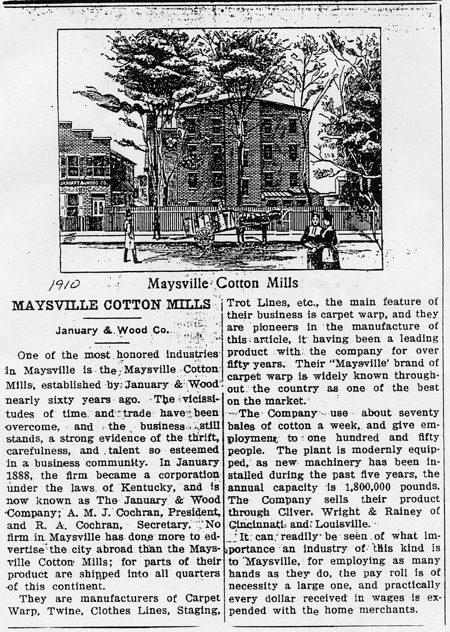 One of the most important things about settling any area is the ability to bring jobs to town residents. In Maysville it was the January and Wood Cotton Mill. It was the bread and butter for most of Maysville's residents.