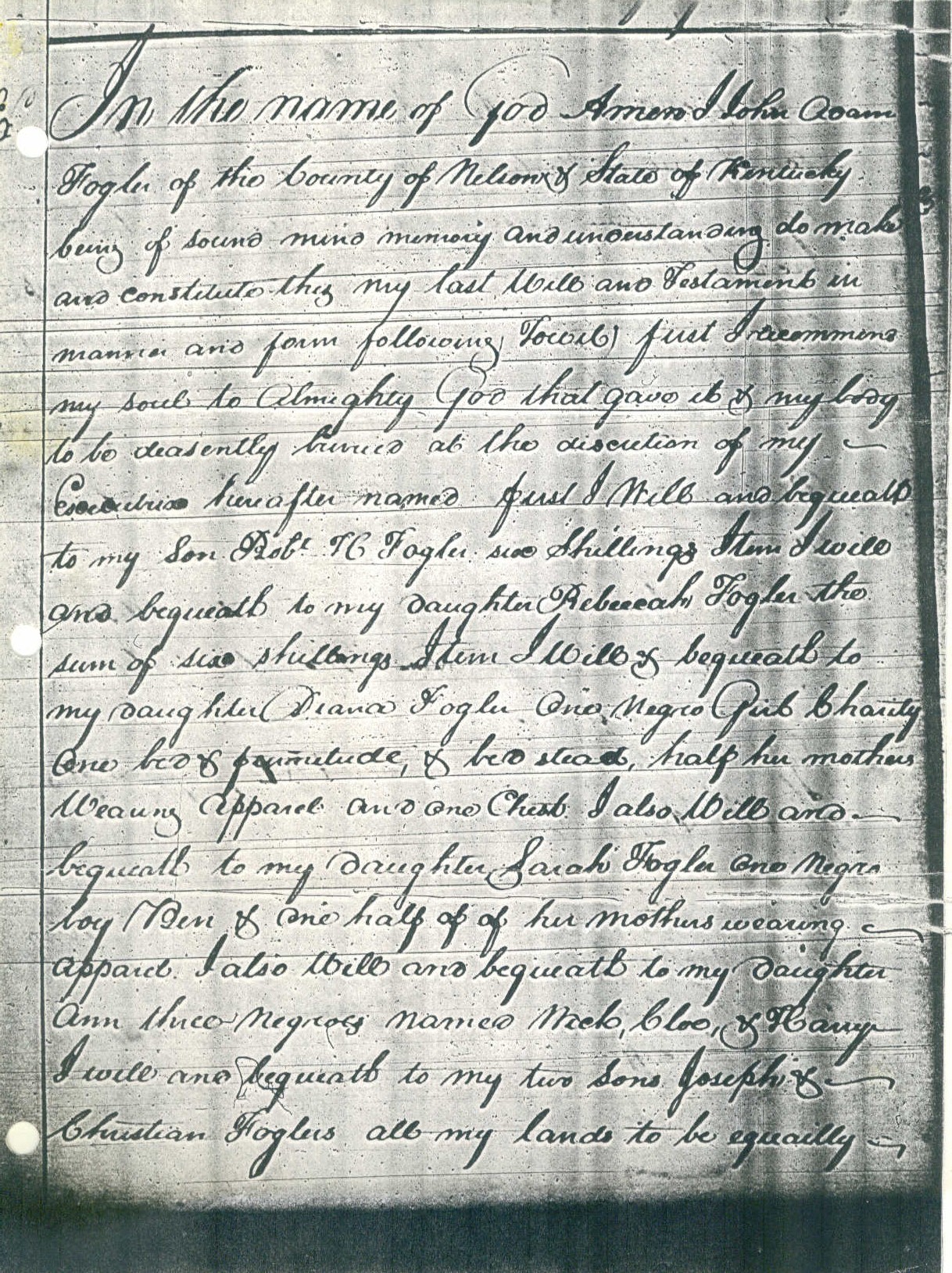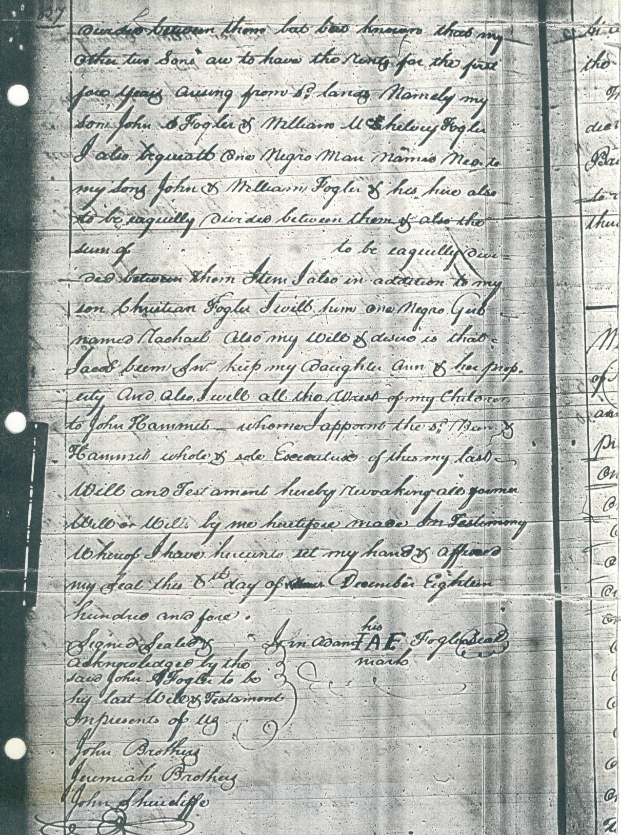 In the name of God Amen I John Adam Fogler of the County of Nelson & State of Kentucky being of sound mind memory and understanding do make and constitute this my last Will and Testament in manner and form following, Towit, first I recommend my soul to Almighty God that gave it & my body to be deasently buried at the discretion of my Executrix hereafter named first I Will and bequeath to my Son Robt H Fogler six Shillings Item I will and bequeath to my daughter Rebeccah Fogler the sum of six shillings Item I Will & bequeath to my daughter Diana Fogler One Negro Girl Charity One bed & furniture, & bedstead, half her mothers Wearing Apparel and one Chest. I also Will and bequeath to my daughter Sarah Fogler one Negro boy Ben & one half of of her mothers wearing apparel. I also Will and bequeath to my daughter Ann three Negroes named Wick, Cloe, & Harry I will and bequeath to my two Sons Joseph & Christian Foglers all my lands to be equailly divided between them but be it known that my other two Sons are to have the rents for the first fore years arising from sd lands Namely my Son John A Fogler & William Mckelvey Fogler I also bequeath One Negro Man named Ned to my Sons John & William Fogler & his line also to be eaquilly divided between them & also the sum of (blank) to be eaquilly divided between them Item I also in addition to my son Christian Fogler I will him one Negro Girl named Rachael. Also my Will & desire is that Jacob beem Sr. keep my daughter Ann & her property And also, I will all the Wrest of my Children to John Hammet whome I appoint the sd Beem & Hammet whole & sole Executrix of this my last Will and Testament hereby revoaking all former Will or Wills by me heretofore made In Testimony Whereof I have hereunto set my hand & affixed my Seal this 6th day of December Eighteen hundred and fore. his John Adam IAF Fogler(Seal) mark Signed Sealed & Acknowledged by the said John A Fogler to be his last Will & Testament In presents of us John Brothers Jeremiah Brothers John Shircliffe |
