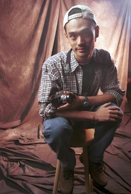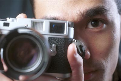 So, he calls me up one day and says he needs somebody to take his picture, and would I mind. Sure. For a price. He had to do Cornholio for me. The big sqaure picture up here, that's it. The picture on the top of the column at the left... Bahar suddenly realizes he's on the wrong side of the camera. And the boy LOVES his Leica (below).