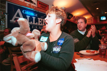 | Jessica Bell, of the Albemarle County, Va., GOP, reacts to a CNN report that Vice President Al Gore did not win the state of Florida. News agencies flip flopped throughtout the night, before finally declaring in the wee hours of the morning that neither Gore nor Bush had won what became a key state in the election. |