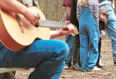 | Four year old Chelsie Tomlin peaks out from a group of her family members while guitartist Sigurd Spearing plays 'Amazing Grace,' during a dedication ceremony for the 25th Habitat for Humanity House to be built in the Charlottesville-Albemarle area. Construction will begin on the Tomlin's home in mid-May 2001. |