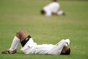 Virginia's Ryan Gibbs (front) and Kenny Arena react after losing to Creighton University 0-3 in the quarterfinal round of the 2000 NCAA soccer tournament.