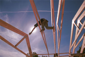 Alexis Zeigler reaches out to help steady a roof truss hoisted up onto the existing roof of his house in Charlottesville, Va. Approximately 30 of Zeigler's friends helped hoist the trusses up by hand, work that is typically done with a crane.