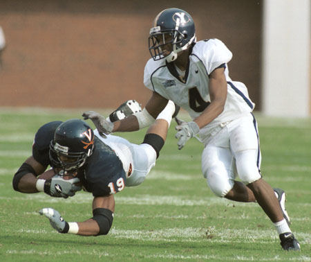 Virginia's Demetrius Johnson (front) falls to the turf after catching a pass from quarterback Dan Ellis in front of Brigham Young University's Isiah Joiner.