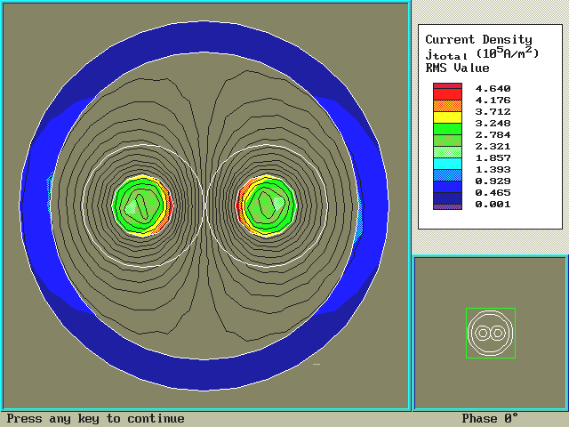 Note the approx. 3 to 1 difference in current density from the outside edges of the wire pair to the inside, due to the mutual inductance partially canceling the self-inductance. The phenomena of self-inductance, mutual inductance, and skin effect all come into play here. This is also known as current bunching.