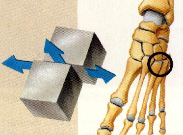 Saddle--The concave surfaces of two bones articulate with one another. All movements are possible, but rotation is limited. An example is the carpometacarpal joint of the thumb. |