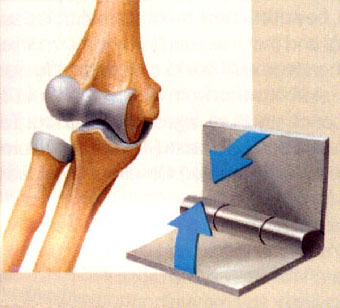 Hinge--The C-shaped surface of one bone swings about the rounded surface of another. Movement is limited to flexion/extension. Examples are the elbow, ankle, and the interphalangeal joints. |
