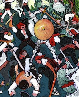 Y, a las primeras, dio don Quijote una cuchillada a uno, que le abrió un sayo de cuero de que venía vestido, con gran parte de la espalda.