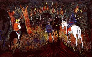 No es eso, respondió Don Quijote, sino que al sabio a cuyo cargo debe de estar el escribir la historia de mis hazañas, le habrá parecido que será bien que yo tome algún nombre apelativo, como lo tomaban todos los caballeros pasados; cual se llamaba << el de la Ardiente Espada>> cual <<el del Unicornio>> aquel<< de las Doncellas>>.aqueste<<el del Ave Fénix>>, el otro<<el caballero del Grifo>>,estotro<<el de la Muerte>>, y por estos nombres e insignias eran conocidos por toda la redondez de la tierra, y así digo, que el sabio ya dicho te habrá puesto en la lengua y en el pensamiento ahora, que me llames <<el Caballero de la Triste Figura>>, como pienso llamarme de hoy en adelante; y para que mejor me cuadre tal nombre, determino de hacer pintar, cuando haya lugar,en mi escudo,una muy triste figura.