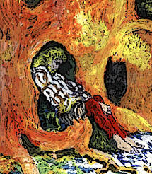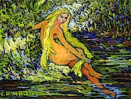 Los luengos y rubios cabellos no solo le cubrieron las espaldas, mas toda en t o r no la escondieron debajo de ellos, que si no eran los pies, ninguna otra cosa de su cuerpo se parecía: tales y tantos eran. En esto les sirvió de peine unas manos, que si los pies en el agua habían parecido pedazos de cristal, las manos en los cabellos semejaban pedazos de apretada nieve