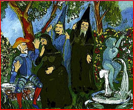 Y luego la Dolorida y las demas dueñas alzaron los antifaces con que cubiertas venian, y descubrieron los rostros todos poblados de barbas, cuales rubias, cuales negras, cuales blancas y cuales albarrazadas, de cuya vista mostraron quedar admirados el duque y la duquesa, pasmados don Quijote y Sancho, y atonitos todos los presentes.