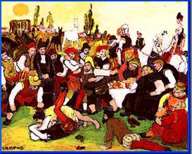 mas el barbero hizo de suerte que el cabrero cogió debajo de sí a Don Quijote, sobre el cual llevo tanto numero de mojicones, que del rostro del pobre caballero llovía tanta sangre como del suyo. Reventaban de risa el canónigo y el cura....