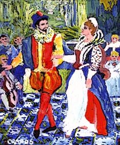 Entre las damas había dos de gusto pícaro y burlonas, y, con ser muy honestas, eran algo descompuestas, por dar lugar que las burlas alegrasen sin enfado. Estas dieron tanta priesa en sacar a danzar a don Quijote, que le molieron, no solo el cuerpo, pero el ánima.
