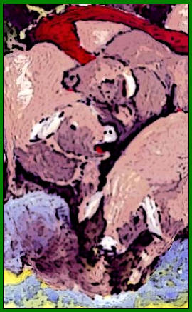 Llegó de tropel la estendida y gruñidora piara, y, sin tener respeto a la autoridad de don Quijote, ni a la de Sancho, pasaron por cima de los dos, deshaciendo las trincheas de Sancho, y derribando no sólo a don Quijote, sino llevando por añadidura a Rocinante. El tropel, el gruñir, la presteza con que llegaron los animales inmundos, puso en confusión y por el suelo a la albarda, a las armas, al rucio, a Rocinante, a Sancho y a don Quijote.