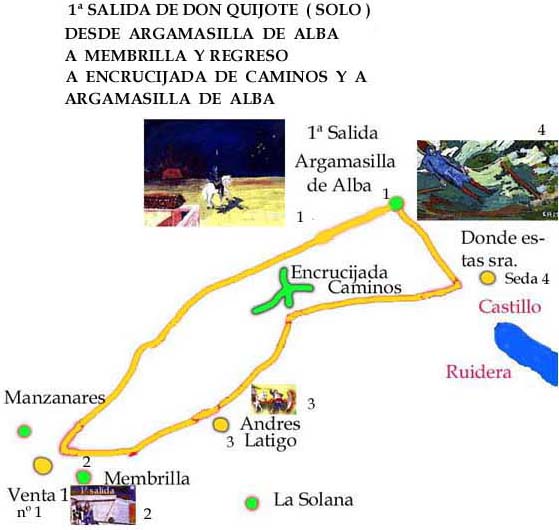 Bien claro esta que saliendo desde Argamasilla de Alba en la 1ª salida le daba el sol mas de lleno ya que caminaba hacia el suroeste a la venta donde fue armado Caballero y, en esta 2ª salida, el soslayo que dice Cervantes le daba por la izquierda a unos 45º. Estudiando las palabras de Cervantes no es tan difícil situarse aun sin conocer la topografía del terreno en este caso de la 1ª Salida como se ve en el plano de arriba.