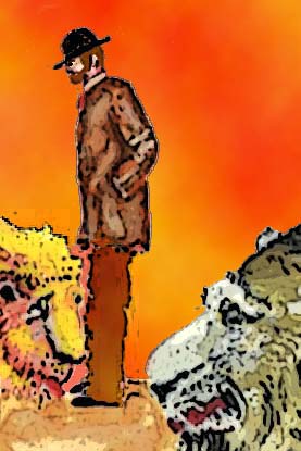 El señor Egea cruzaba valerosamente sus brazos, viéndose rodeado de feroces leones, enflaquecidos de hambre, que se le postraban y le lamían desde las rodillas hasta sus zapatillas de terciopelo malva, bordadas por doña Corazón