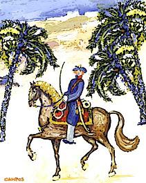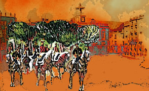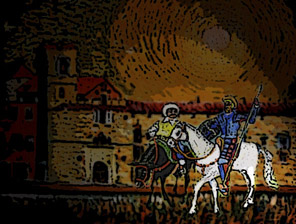 Cara Rajada , personaje al que no han sacado en películas y obras teatrales todo lo que puede dar de sí. En esta secuencia de su entrada a Oleza,- se veía él,- triunfante de sus correrías carlistas, y que Paulina quedaría fascinada al verle. Situado, por la zona de la puerta de Crevillente.