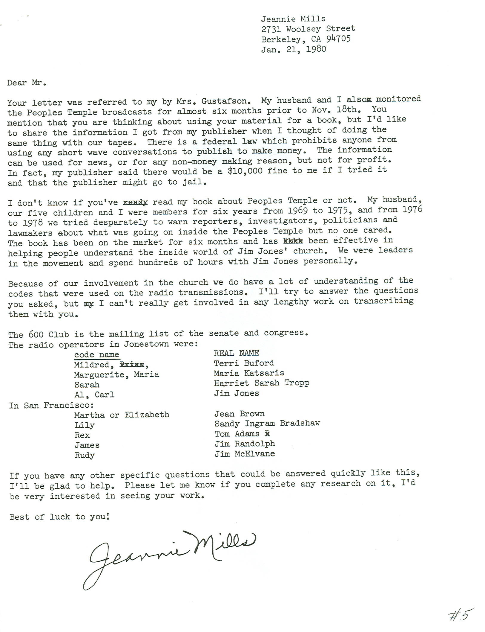 This letter is intersting because Mills provides the code names for many of the operators in the Temple. The list is not complete, however. Several significant operators are missing from the list such as the Carter brothers, Paula Adams, Laura Johnston, and (prior to May, 1978) Deborah Layton.