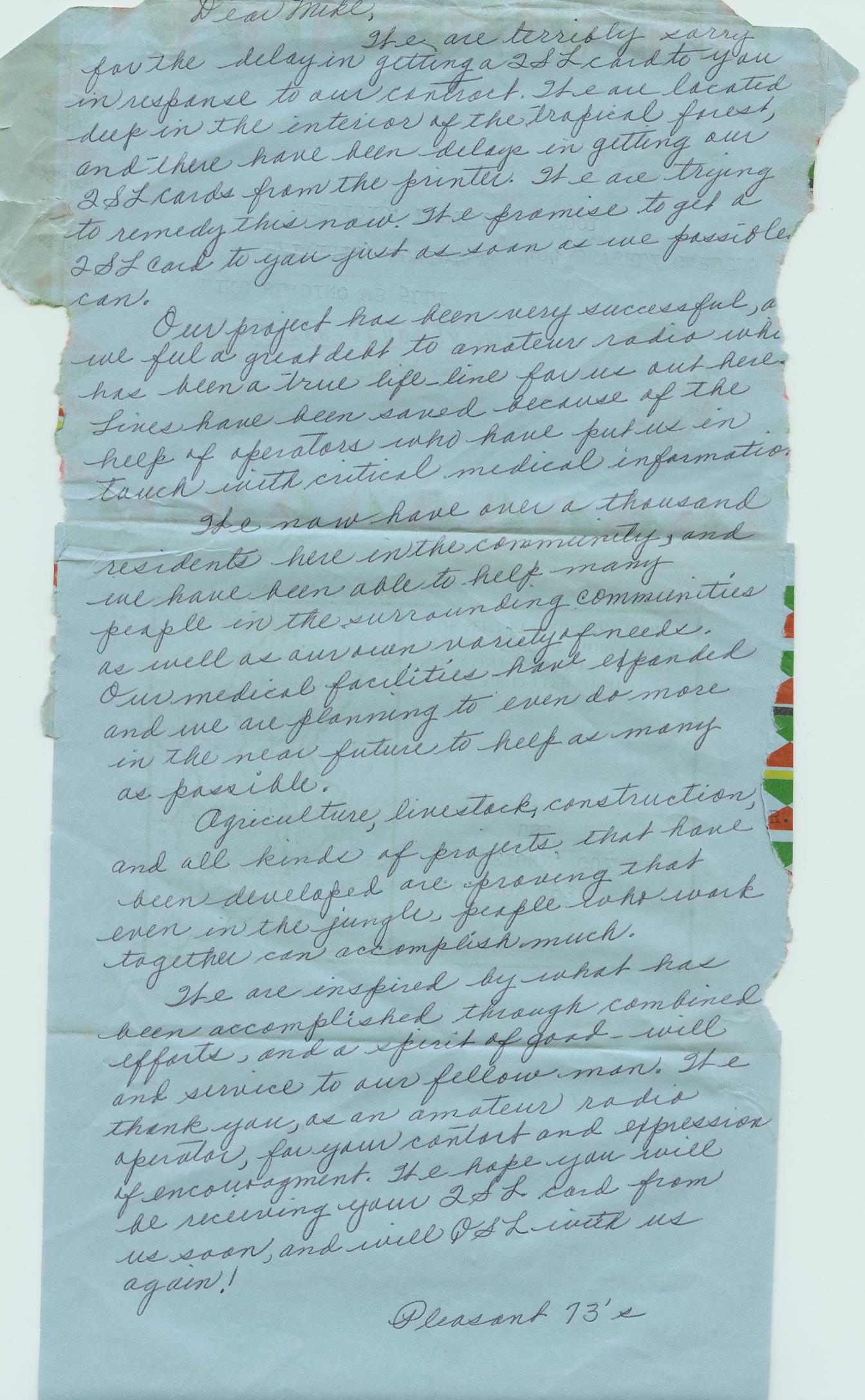 | In addition to QSL cards, Peoples Temple occasionaly sent out letters to hams in the United States. Like many of the QSL, these letters appear to have been mass produced using a script from which the writer would copy.All the examples I have seen have been worded exactly the same and appear to have been written by the same individual. As always, I am keeping an eye out for more of these letters to see if there are any different versions. |
