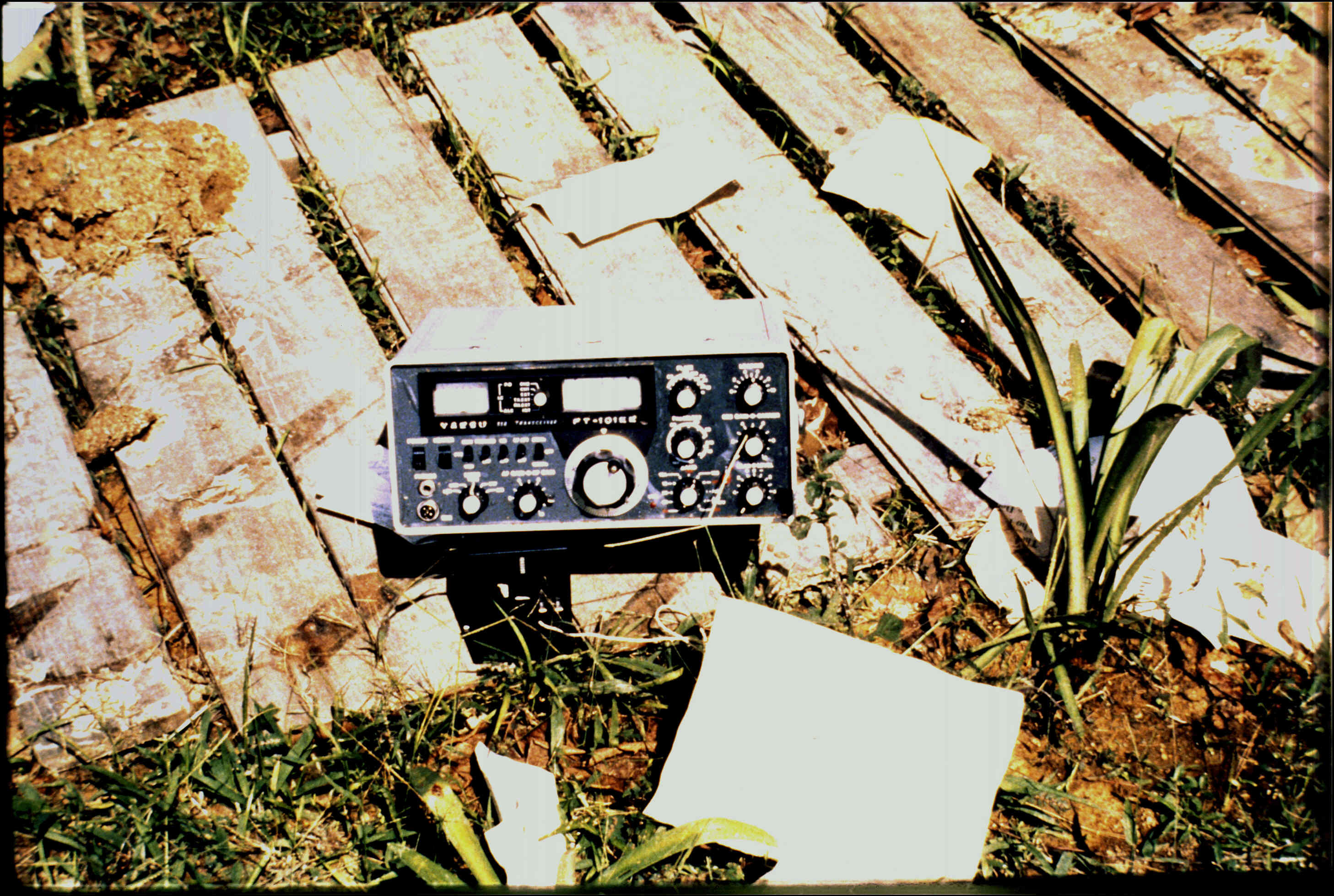 | The image to the right is from a slide photograph. It is of a Yaesu FT-101 EE sitting on the planked boardwalk of Jonestown. This is one of 2 ham radio transceivers belonging to Peoples Temple that the FBI took from Jonestown as evidence. Despite numerous requests, the FBI has failed to locate either radio and cannot account for their discposition. |