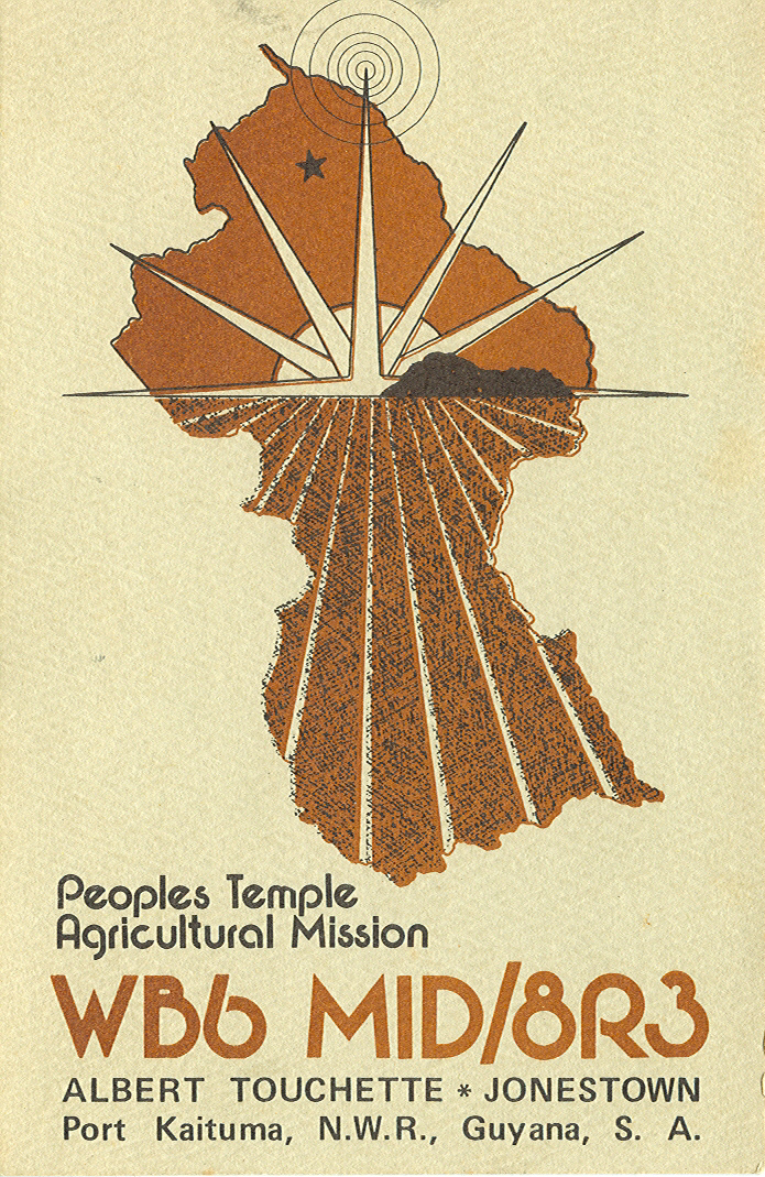 | Although there were four amatuer radio license holders in Peoples Temple, only two kinds of QSL cards were made for 2 of those calls. One style is the "Tri-panel" card, and the other is what I call the "map" card. You will find examples below. |
