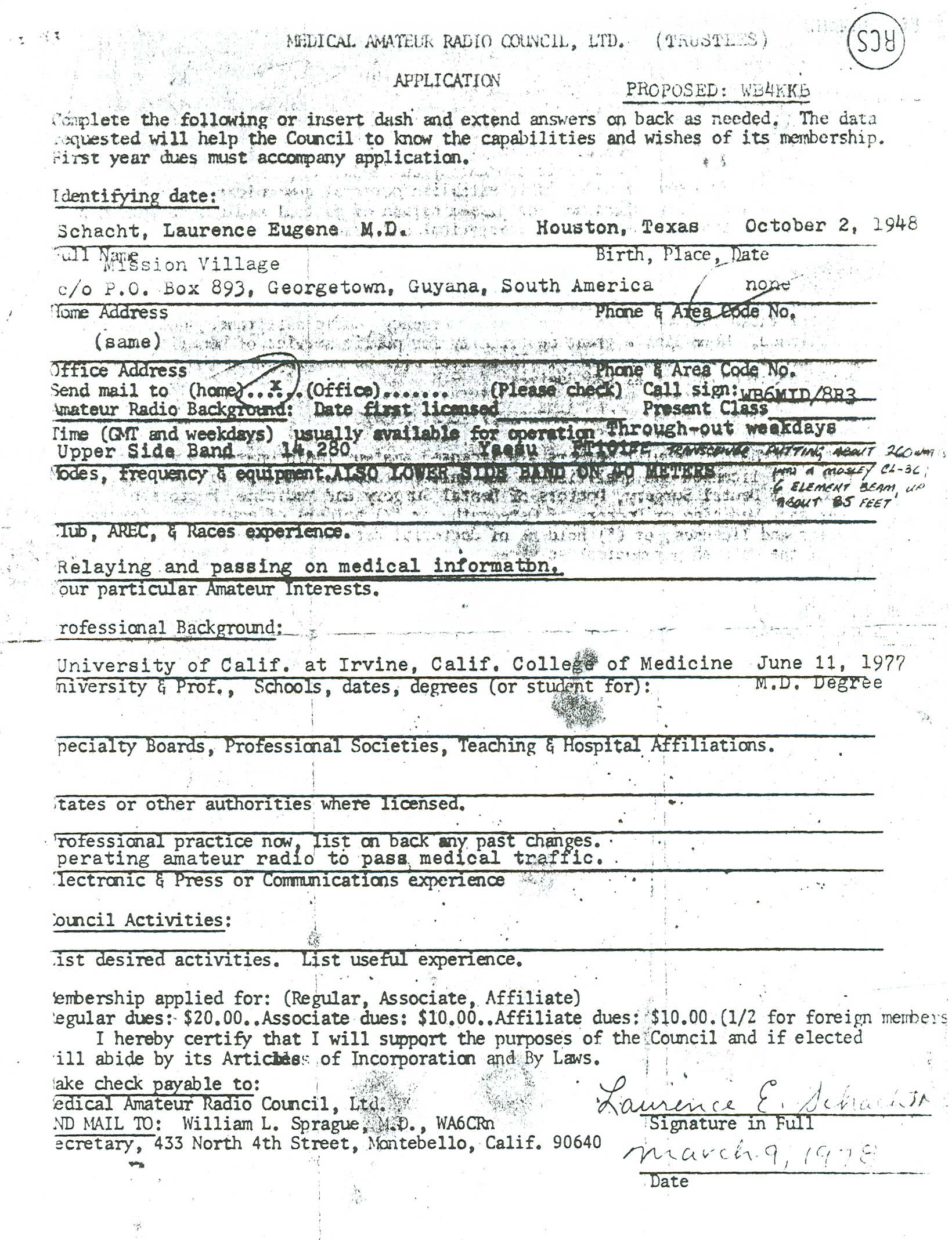 | Below is a copy of Larry Schacht's application to the Medical Amateur Radio Council. From MARCO's website: "The purpose of MARCO is to promote good will and fellowship among amateur radio operators, worldwide, who are professionals in the healing arts, or who have an interest in the various medical, dental and allied fields which constitute the healing arts. On-the-air network operation is considered an integral part of MARCO activity, and is conducted for the purpose of discussing and exchanging medical and technical information, and, wherever possible, to be of public service by assisting medical emergencies and other priority traffic." |