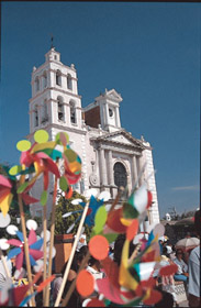 Hermoso templo construido en diversas etapas, muy posiblemente desde el siglo XVI. Fue concluido en 1874 y cuenta con una fachada neoclásica de columnas de cantera blanca y una singular torre adornada con flores blancas sobre fondo rosa (aunque recientemente ha sido pintado). En su parte superior se encuentra un reloj que data de 1897.