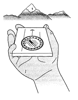 compass at eye level, sighting both the distant object through