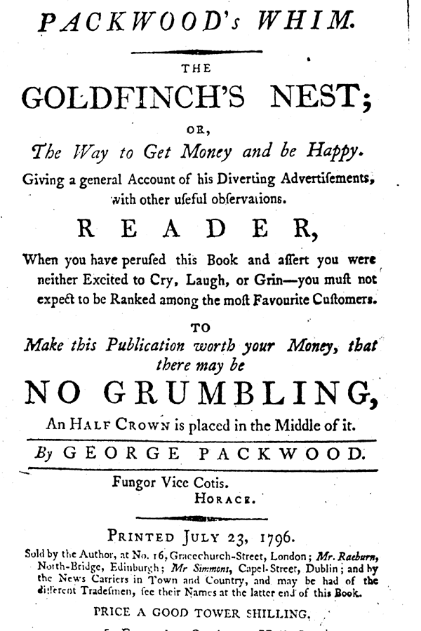 The small book of some forty-six pages is mostly a pasting together of small advertisements that Packwood placed in various papers. The advertisements took the form of poetry, dialogue between friends, servants or acquaintances, songs, short stories (such as the one above), and of course information about his product, where it was manufactured or where it might be purchased.
